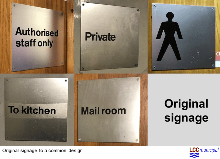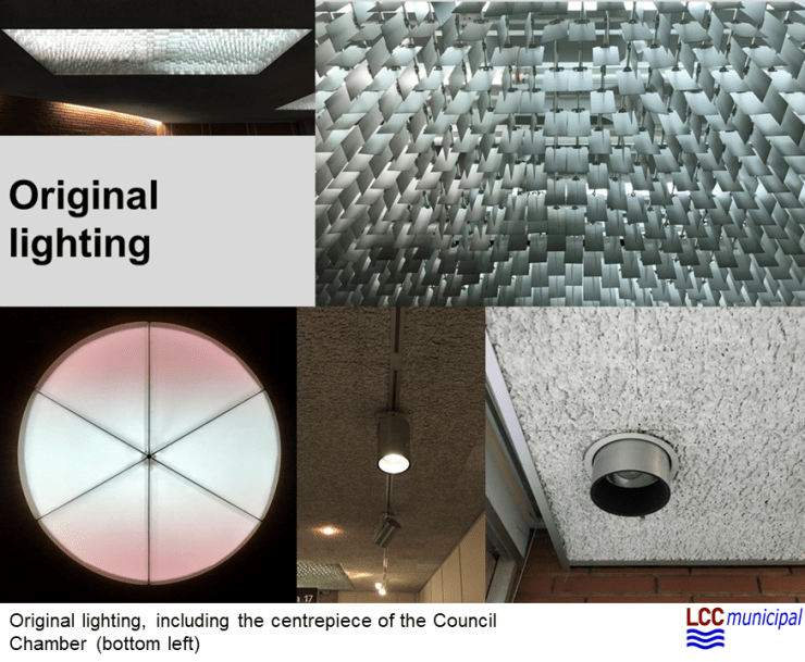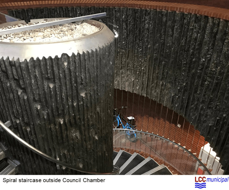 Highlights were many and varied. Having passed through some extraordinary metal doors, which had the rough texture of a Bill Mitchell concrete creation, we arrived in the public space around the Council Chamber to find some truly magnificent light fittings in an aesthetic that might be described as “Seventies Arndale Centre”. And then there was the full circle (you get my theme…) of the Council Chamber itself, an intimate space which – cliché alert – provided a genuine “wow” factor. It felt completely contemporary and one could be forgiven for thinking it was about to host its first Council meeting – in fact it had held its final scheduled session the night before.