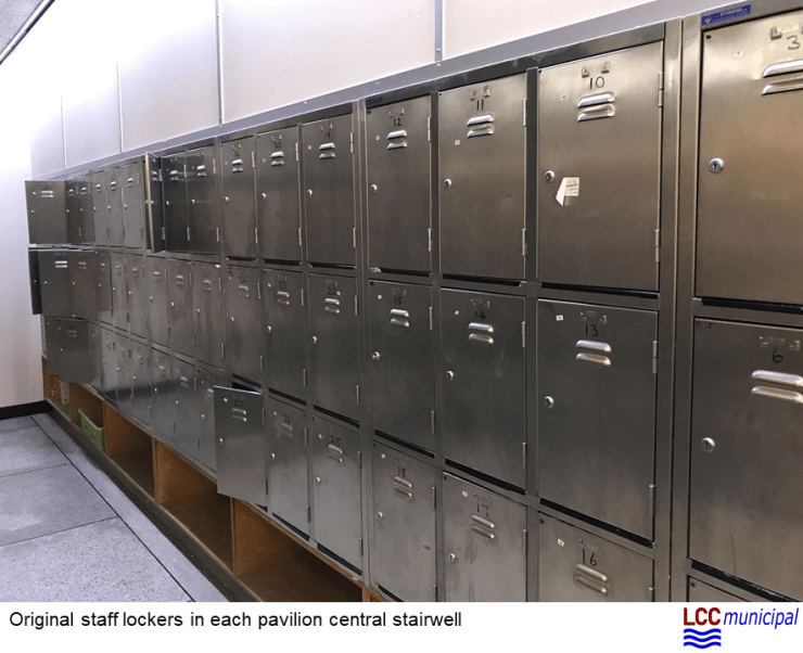 The ceilings of the remaining three open plan office pavilions also impressed: a large grid of strip lights, each one placed in an inverted prism housing. The central stairwells of each pavilion were a mini-brutalist delight, complete with communal staff locker space conveniently placed around the stairs.