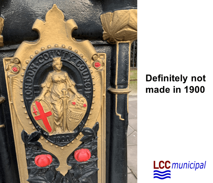 The replicas are a mishmash of the 1900 design bearing the putative Britannia and the 1929 LCC crest version. What I hadn’t noticed until I undertook my inspection of January 2020 was the paint scheme applied to them.