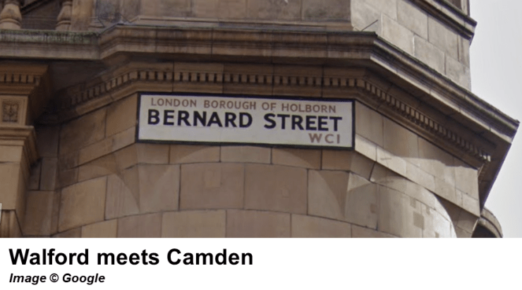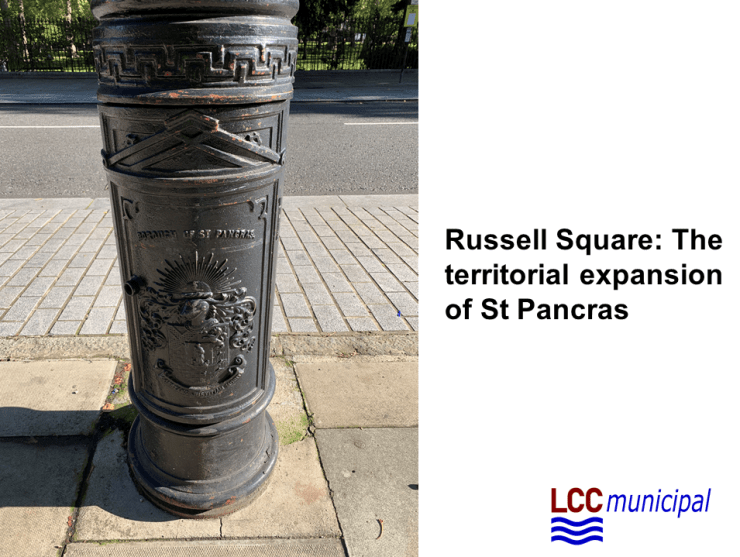 Leaving aside the fact that this is home to a “London Borough of Holborn” street sign, a fictional entity on a par with Walford, the Square is now lined by some gargantuan replica lamp posts which are adorned with the crest of the former Metropolitan Borough of St Pancras. Yet, prior to 1965, the Square was wholly within the Metropolitan Borough of Holborn (as the cack-handed attempt at labelling Bernard Street suggests).